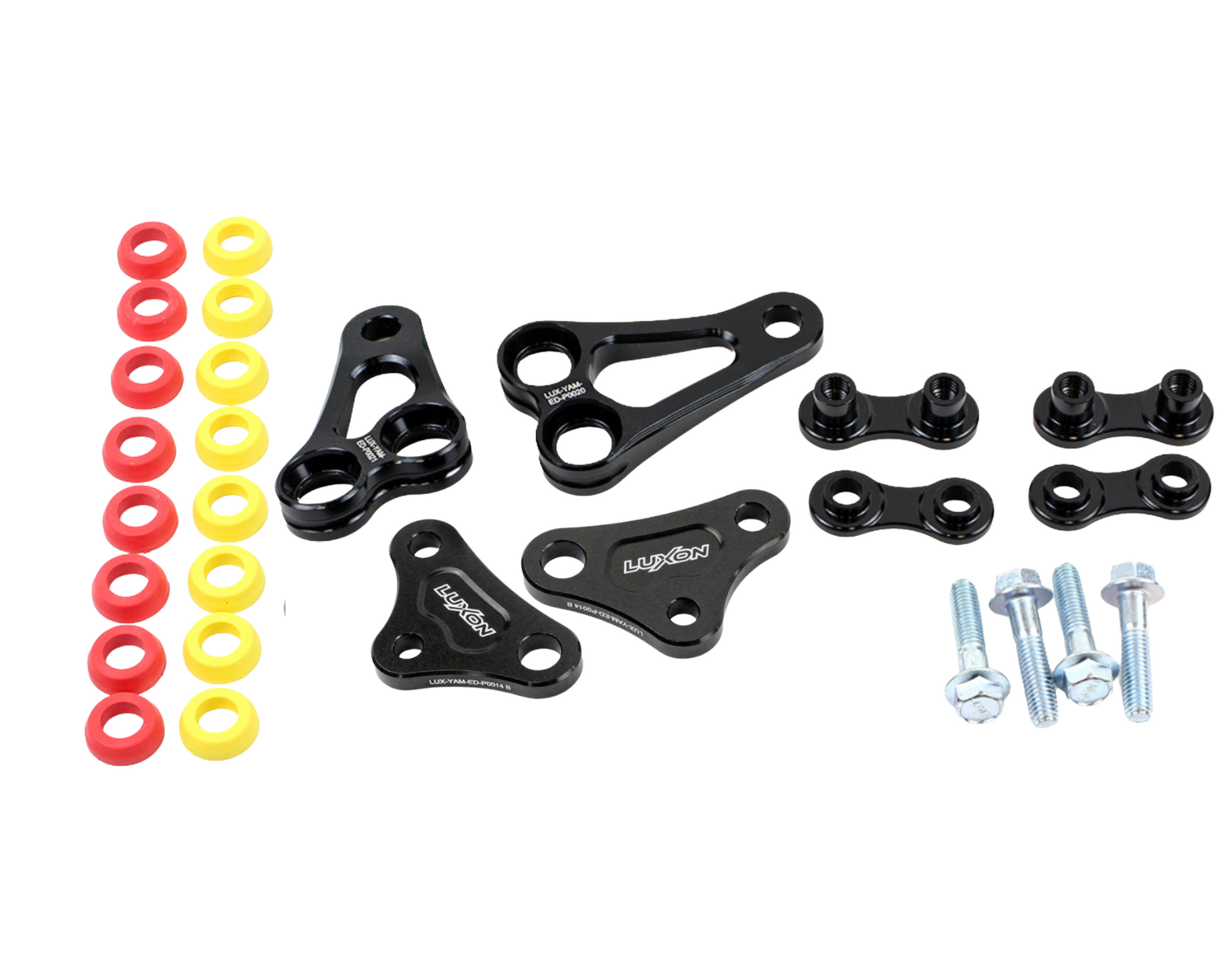 This unique design isolates the upper engine mount from the chassis with rubber bushings, which allows the upper frame spar to flex more than it would with a solid engine hanger for increased comfort and reduced vibration. The flex and feel is adjustable by changing the rubber bushing hardness with the two included bushing sets. Luxon mounts are also a significant weight savings of 0.60 pounds (272g) over stock!